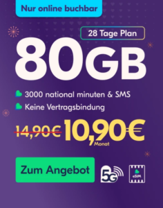 Bei Lycamobile gibt es für Nutzer, die ein hohes Datumvolumen im Inland benötigen, einen grandiosen Prepaid-Tarif mit 5G-Netz und keinerlei Vetragsbindung. Im Flash-Sale ist der National S 5G Tarif von Lycamobile mit 80 GB Datenvolumen im Inland und 23 GB EU-Roaming-Daten. Der Prepaid-Tarif kostet aktuell nur 10,90 Euro monatlich statt der bisherigen 14,90 Euro und ist monatlich kündbar oder läuft aus.